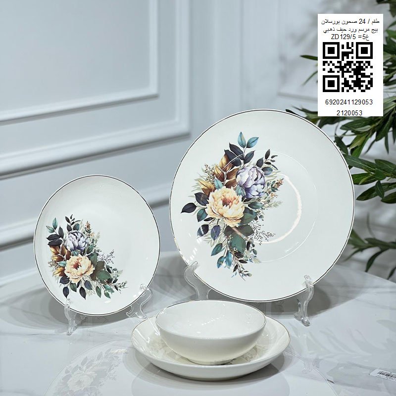 طقم / 24 صحون بورسلان بيج مرسم ورد حيف ذهبي ZD129/5 =غ5