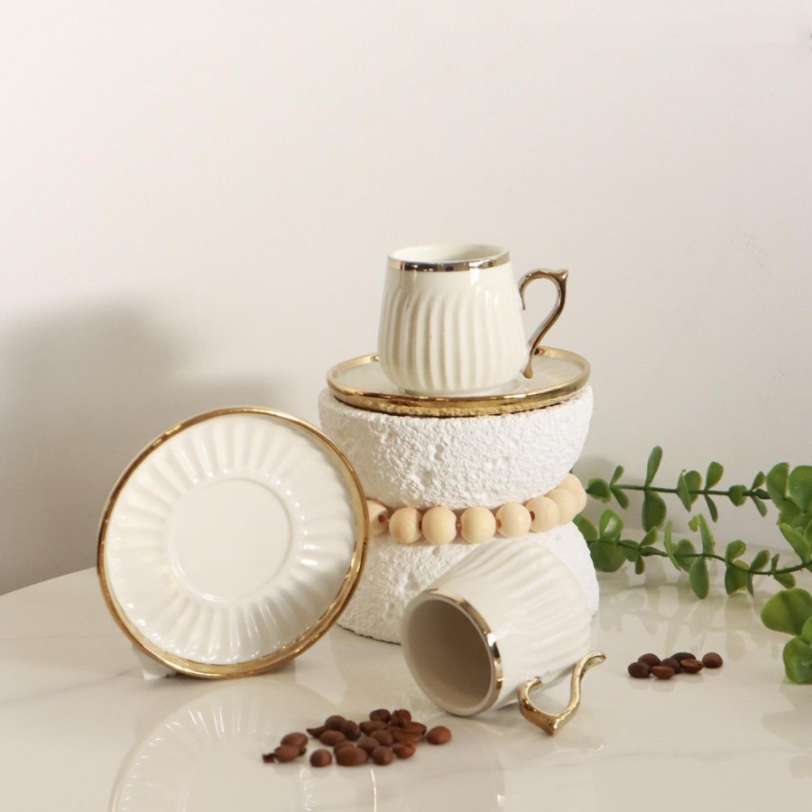 طقم فناجين شاي 6/6 بورسلان ابيض قدرة مكتب قاعدة حيف و يد ذهبي GY2403 ++