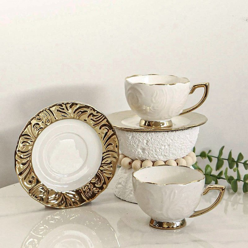 طقم فناجين شاي 6/6 بورسلان ابيض مزخرف قاعدة حيف معرج و يد ذهبي GY2410 ++