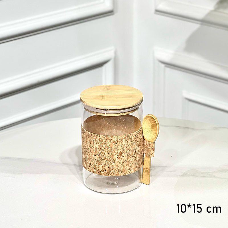 مطربان زجاج شفاف مدور 10*15سم خصر وغطا خشب بامبو مع ملعقة G++ ASC1112