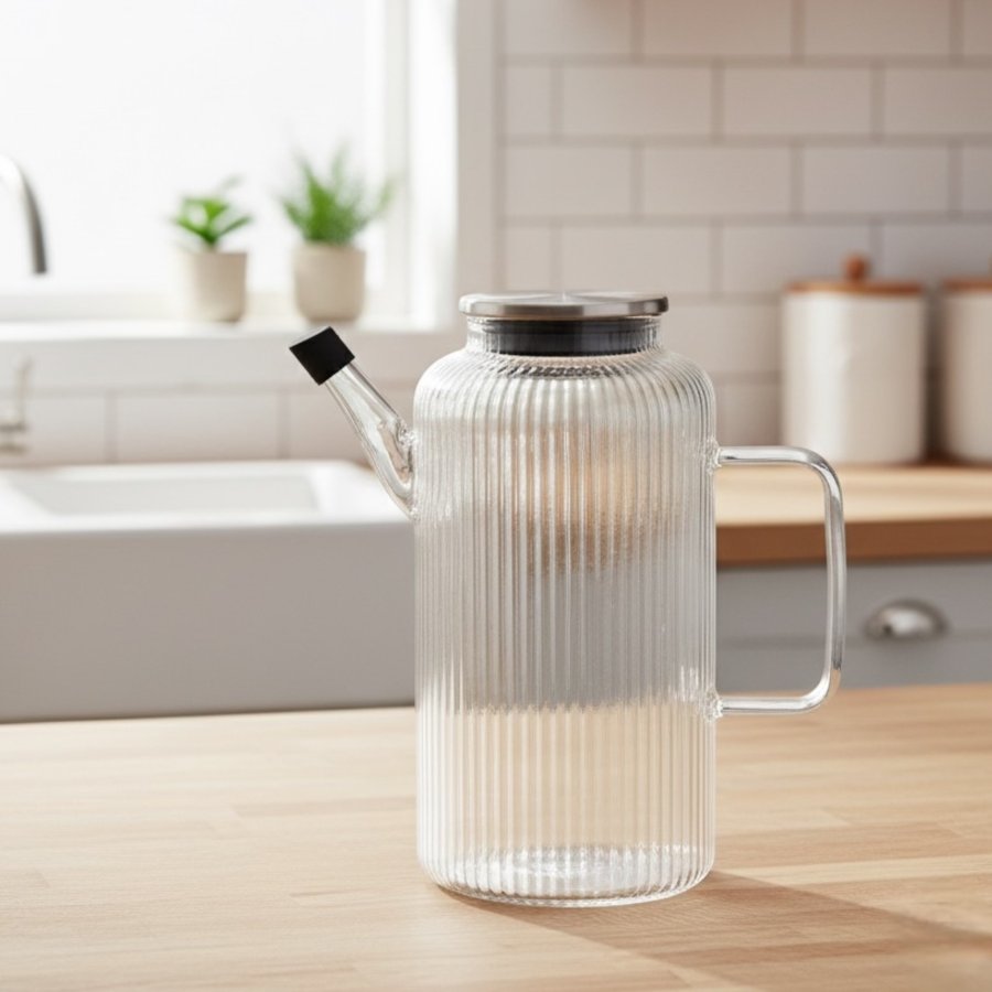 ابريق زيت زجاج شفاف محزز 1لتر غطا ستانلس ستيل سدادة سلكون سكني G++ ASC1121