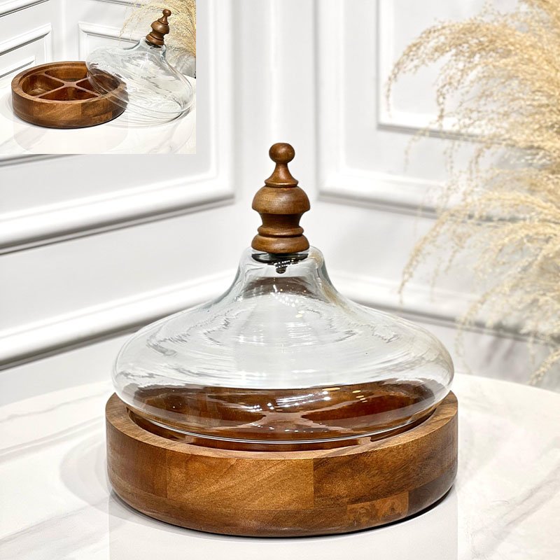 مضيفة خشب 30سم مدور 4 عين غطا زجاج قبة مسكة خشب 202426 %ه4