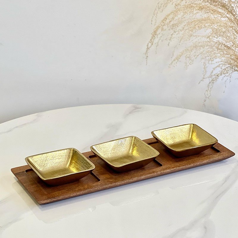 طقم/4 مضيفة خشب مستطيل + 3 صحون نحاس هندي 202437 %ه4