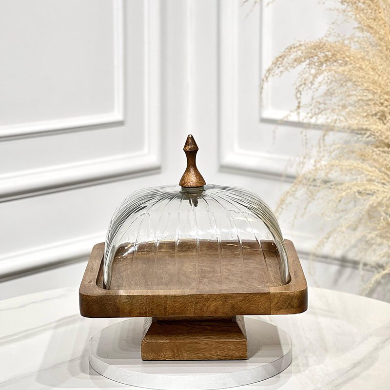 جاط حلويات خشب مربع 25سم غطا زجاج محزز مسكة برجل هندي 202450 %ه4