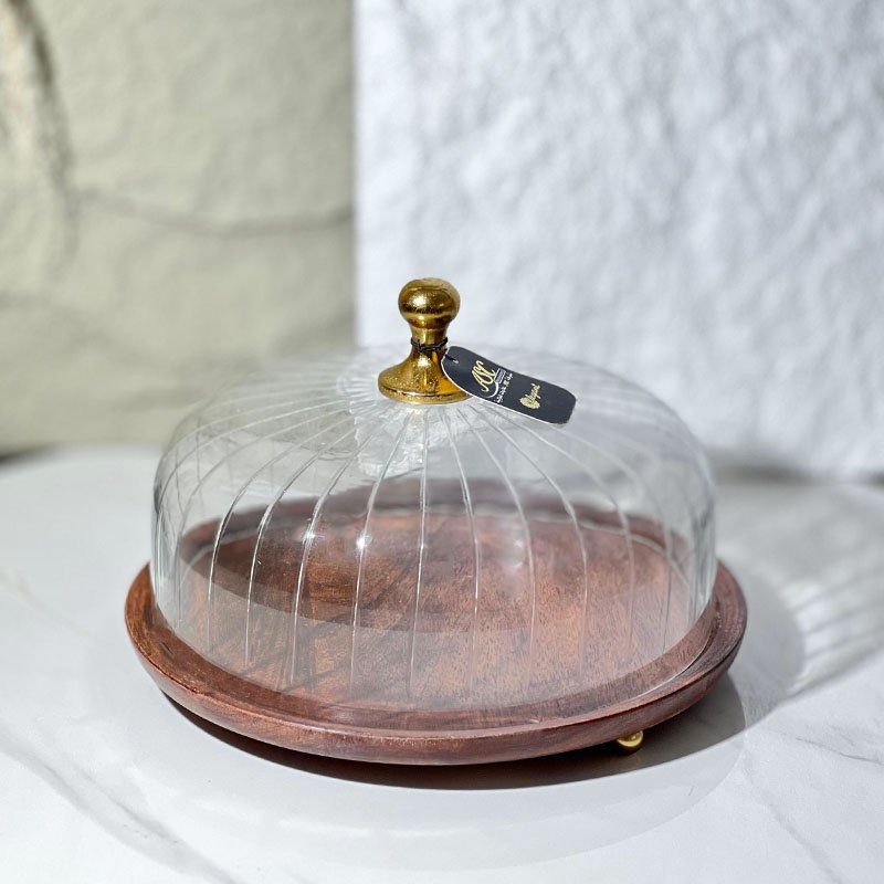 مضيفة خشب مدور31سم غطا زجاج محزز مسكة نحاس هندي 8239414 %ه5