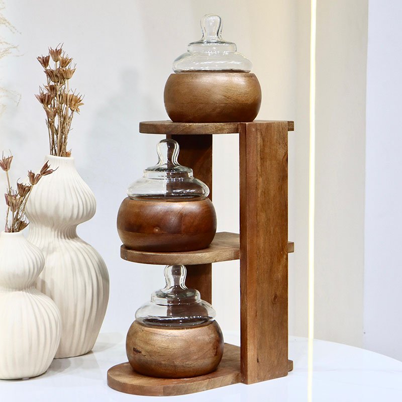 ستاند خشب 3 طبقة 35سم + 3 مضيفة خشب مدور 12سم غطا زجاج HO202441 %ه7
