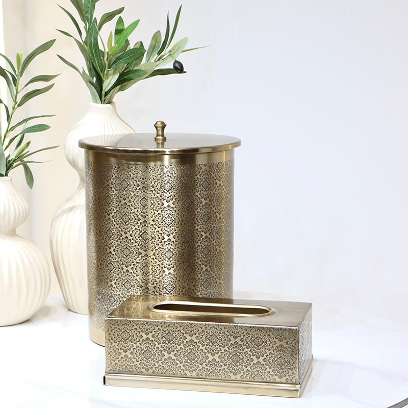 طقم سطل +بكيت محارم مدور مزخرف ورد اسود هندي ذهبي DI-26225-8 %ه8