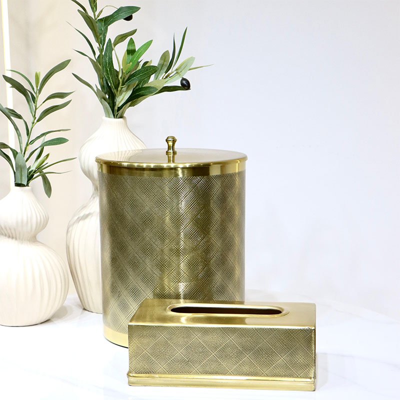 طقم سطل +بكيت محارم مدور مربعات اسود محززهندي ذهبي DI-26225-10 %ه8