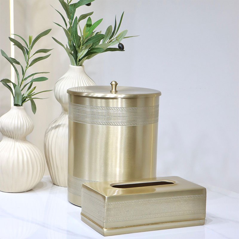 طقم سطل +بكيت محارم مدور مزخرف محزز هندي ذهبي DI-26225-14 %ه8