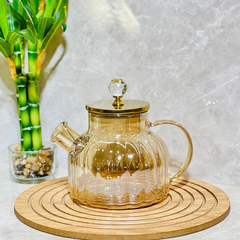 ابريق شاي 1 لتر زجاج عسلي محزز غطا ستانلس ذهبي K8/2 =ض9