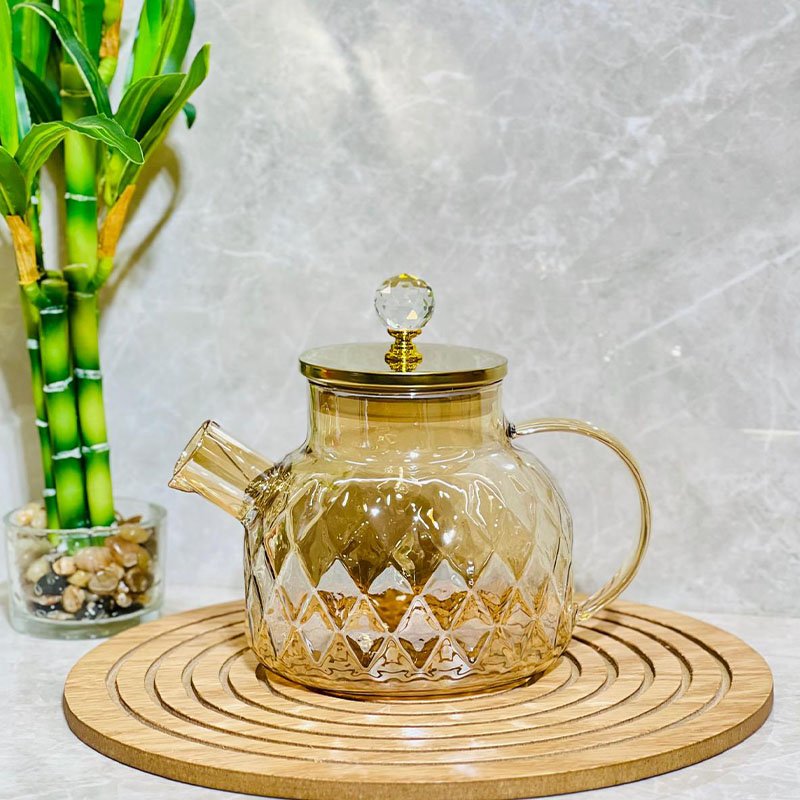 ابريق شاي 1000مل زجاج عسلي بقلاوة غطا ستانلس ذهبي K8/4 =ض7 =ض9