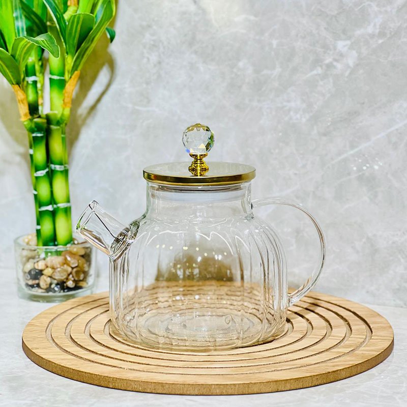 ابريق شاي 1 لتر زجاج سادة محزز غطا ستانلس ذهبي K8/6 =ض9