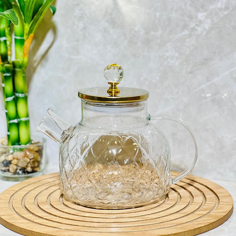 ابريق شاي 1 لتر زجاج سادة بقلاوة غطا ستانلس ذهبي K8/8 =ض9