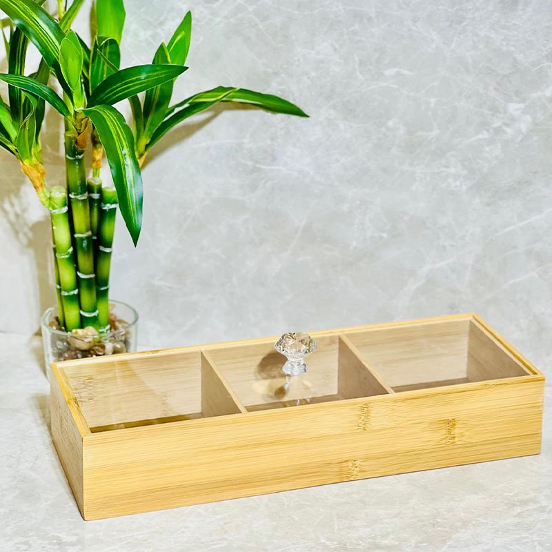 مضيفة مستطيل 3 عين خشب بامبو 33*12سم غطا اكرلك شفاف K140/40 =ض9
