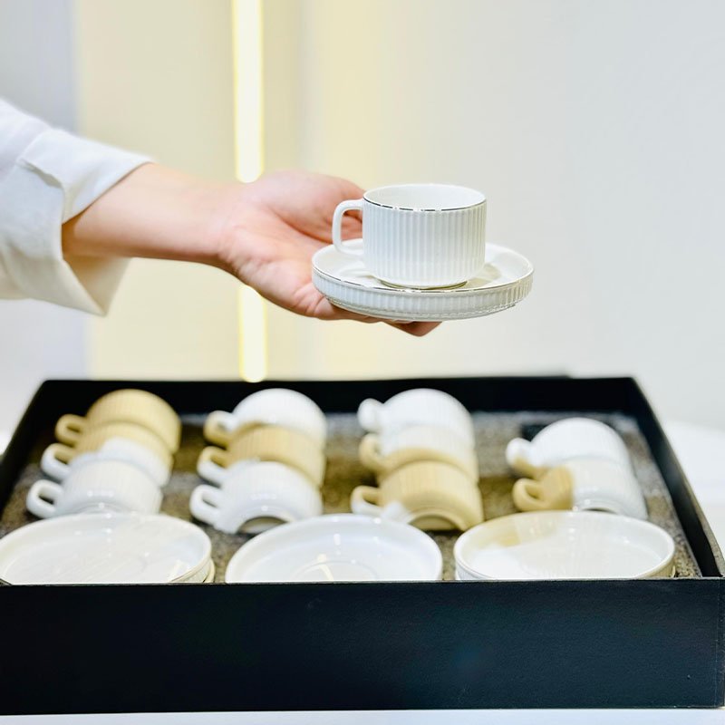 طقم فناجين قهوة 12/12 بورسلان ابيض A102 محزز حيف ذهبي يد قوس ++