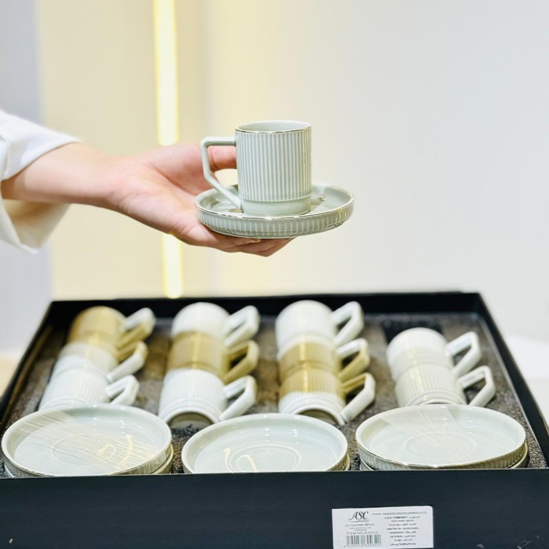 طقم فناجين قهوة 12/12 بورسلان زيتي A103-G محزز حيف ذهبي يد معلوج ++