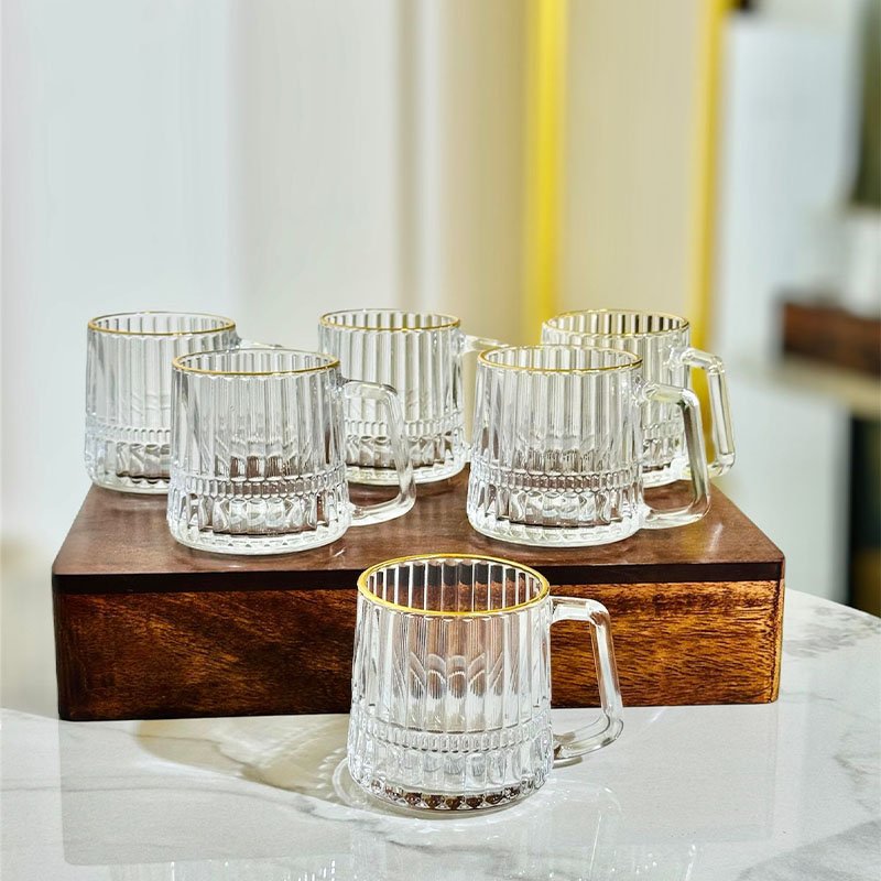 طقم كاسة شاي/6 زجاج سادة 170مل محزز K117/7 حيف ذهبي =VGR3