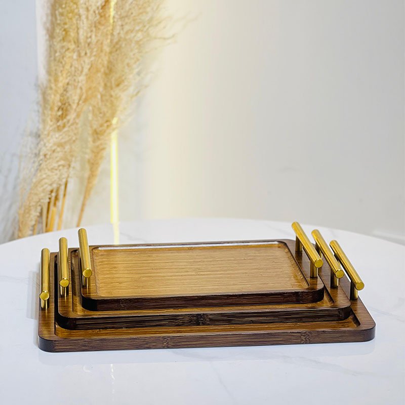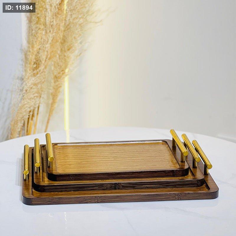 طقم صواني/3 خشب بامبو غامق مستطيل K141/1 بيدين ذهبي =VGR3