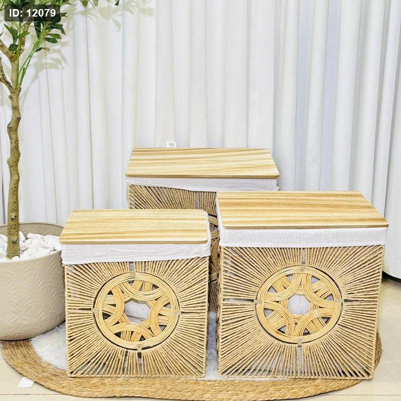 طقم سلال مستطيل/3 احجام قش حبل عقدة غطا خشب K57/7 =ك1