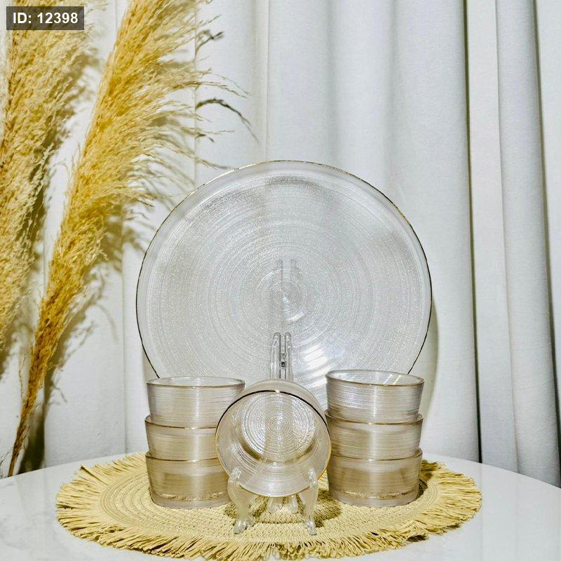 طقم/8 صينية مدور + 7زبادي زجاج محزز بالعرض حيف ذهبي K54/18 =ك4