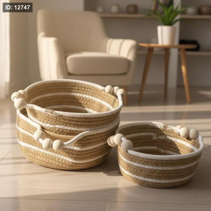 طقم سلال مدور /3 احجام حيف عالي كتان ملون بيدين طابات خشب EL27/11 =ك8
