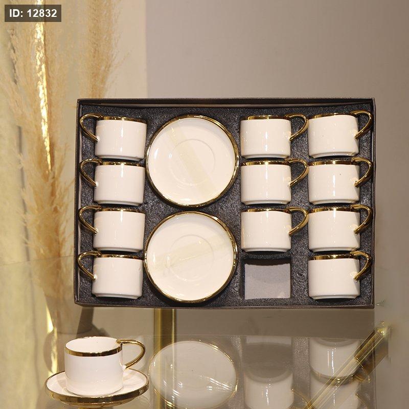 طقم فناجين قهوة 12/12 بورسلان ابيض سادة مدور يد مثلث حيف ذهبي GY2431 ++