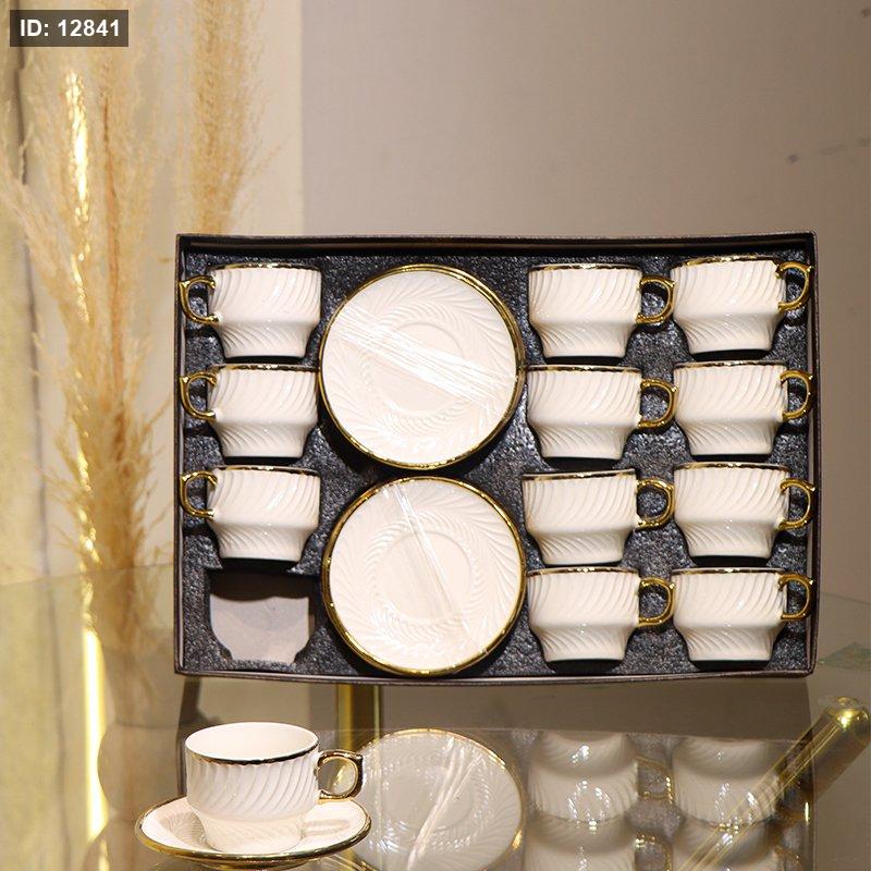 طقم فناجين قهوة 12/12 بورسلان ابيض محزز بقاعدة حيف ذهبي GY2405 ++