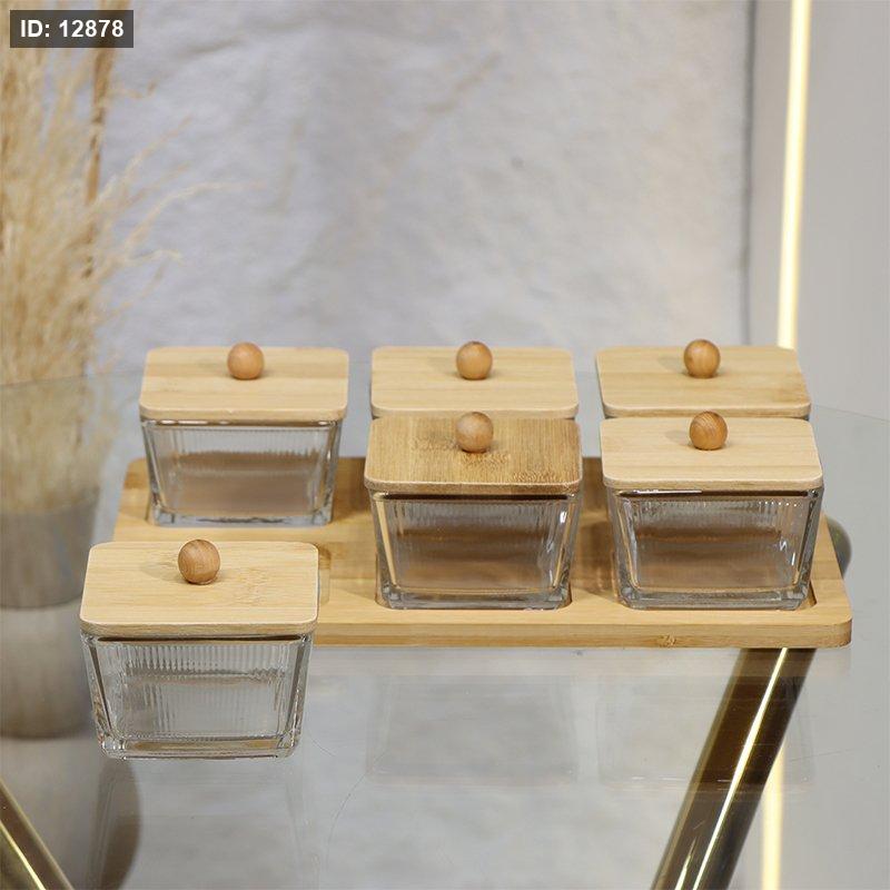 طقم/7 صينية خشب + 6 صحون مكسرات زجاج مربع غطا خشب بامبو EL72/29 =ط55