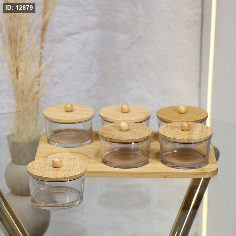 طقم/7 صينية خشب + 6 صحون مكسرات زجاج مدور غطا خشب بامبو EL72/30 =ط55