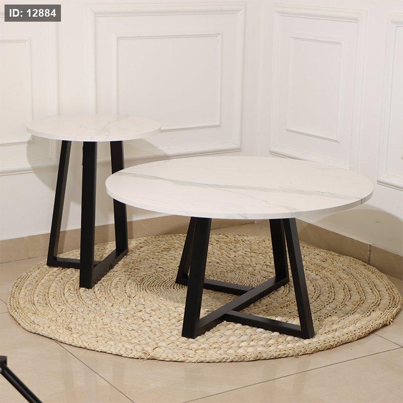 طقم/2 طاولة مدور +اسكملة خشب ماربل ابيض ارجل حديد اسود EL58/5-A =ط55