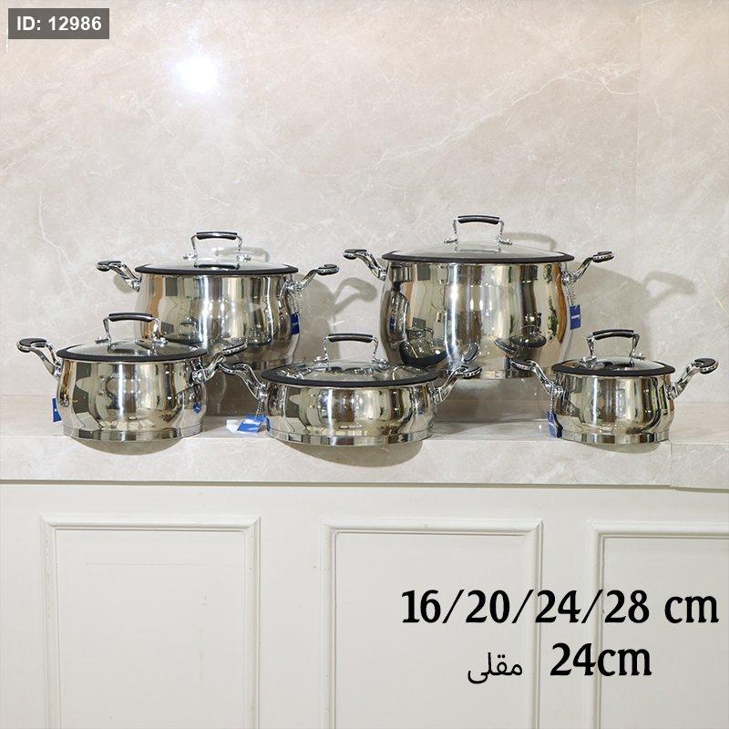 طقم طناجر/10 ستانلس ستيل ثقيل 16/20/24/28 + مقلى 24سم بيدين مغطى سلكون EL122/1 =ط56