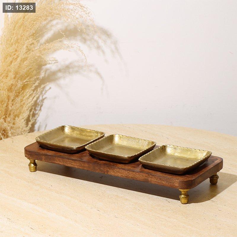 طقم/4 صينية خشب + 3 صحون مكسرات 8239154 مشرف نحاس هندي %ه10
