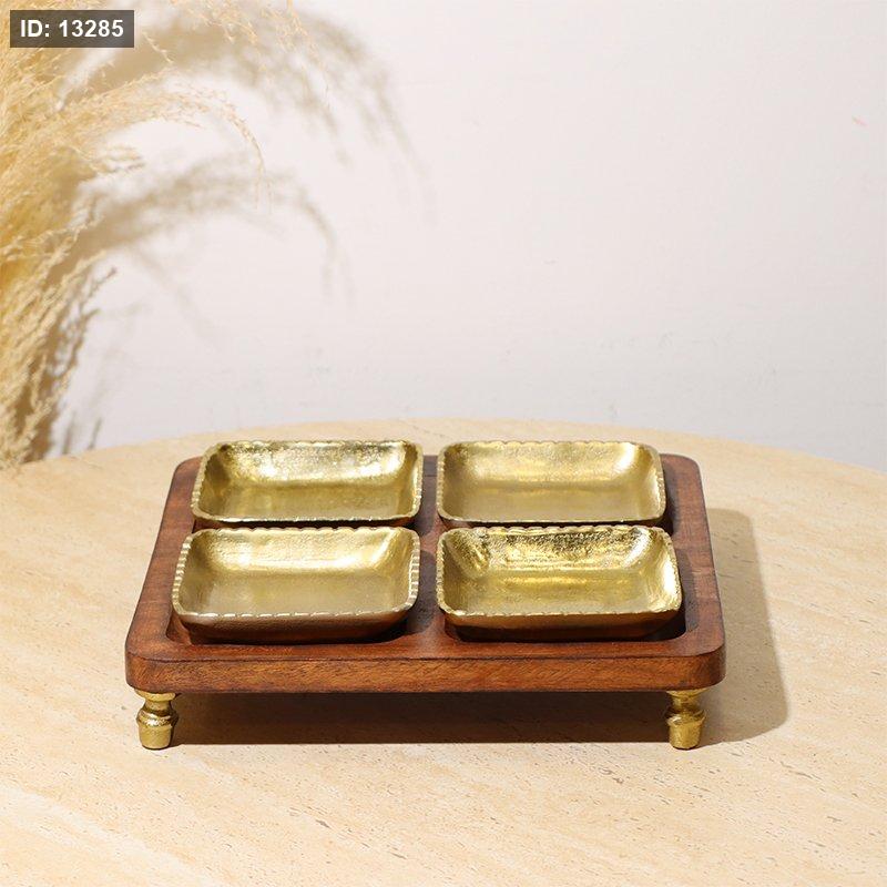 طقم/5 صينية مربع خشب + 4 صحون مكسرات 8239156 مشرف نحاس هندي %ه10