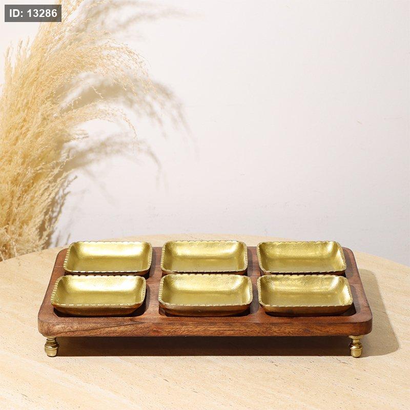 طقم/7 صينية خشب + 6 صحون مكسرات 8239157 مشرف نحاس هندي %ه10