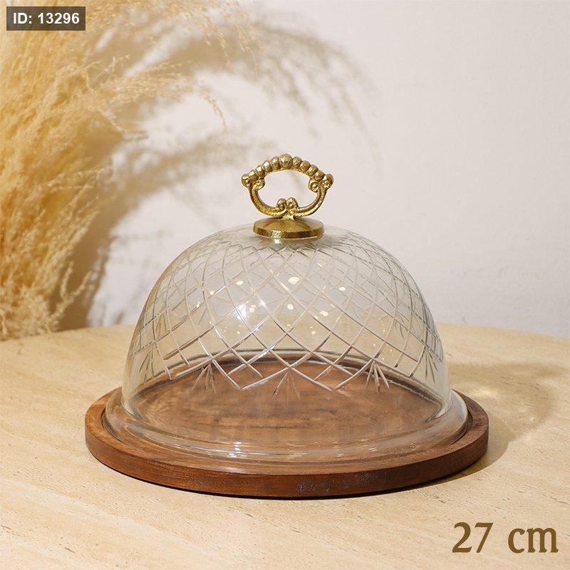 جاط كيك مدور 27سم 8239174 غطا زجاج محزز قاعدة خشب هندي %ه10