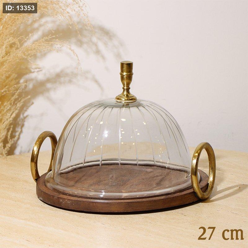 جاط كيك مدور 27سم 8239116 غطا زجاج محزز قاعدة خشب هندي بيدين حلقة %ه10