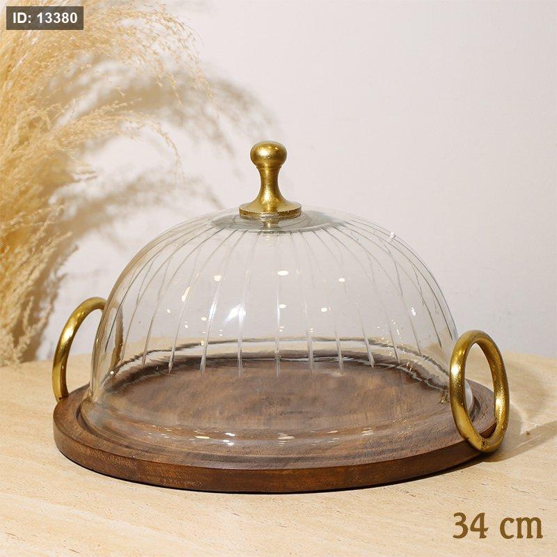 جاط كيك مدور 34سم 8239290 غطا زجاج محزز قاعدة خشب هندي بيدين حلقة %ه10