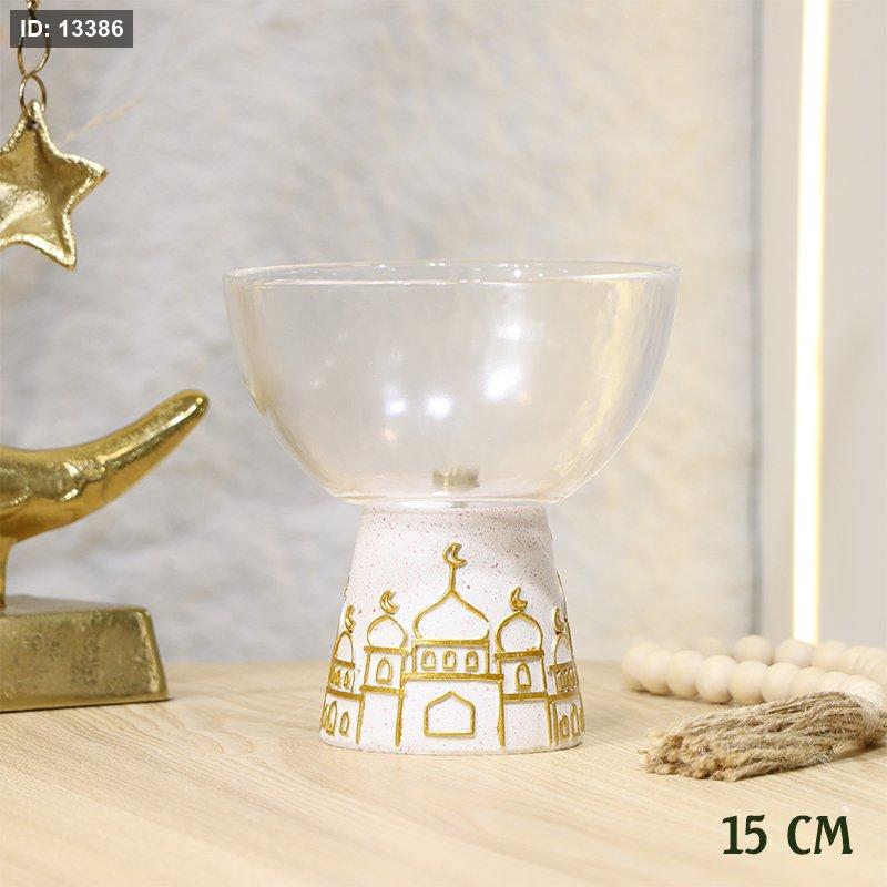 مضيفة زجاج مدور 15سم قاعدة جبص بيج مرسم مسجد ذهبي EL95/2 =ط58