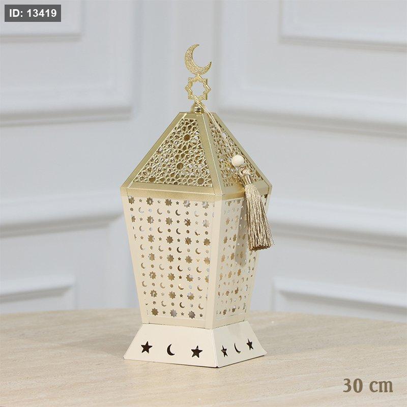 فانوس رمضان مضلع 30سم تنك بيج وذهبي اضاءة ذهبي بطاريات EL91/3 =رم1