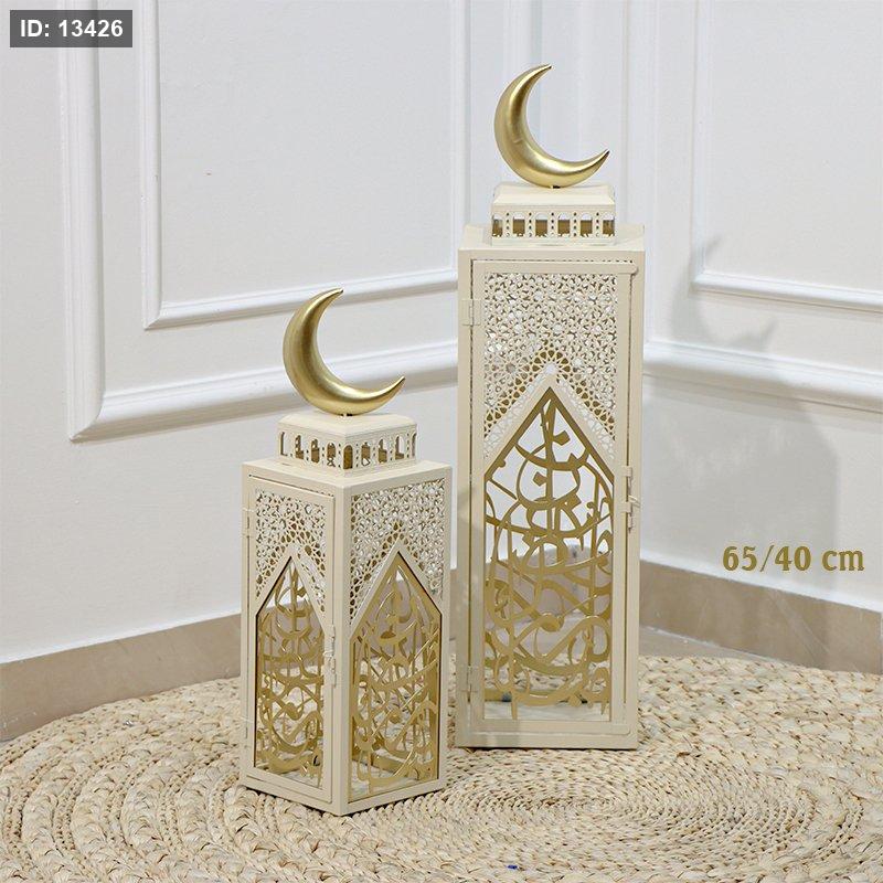 طقم فانوس رمضان/2 احجام مربع 65/40سم تنك بيج EL91/10 =رم1 مكتب رمضان مبارك ذهبي مسكة هلال