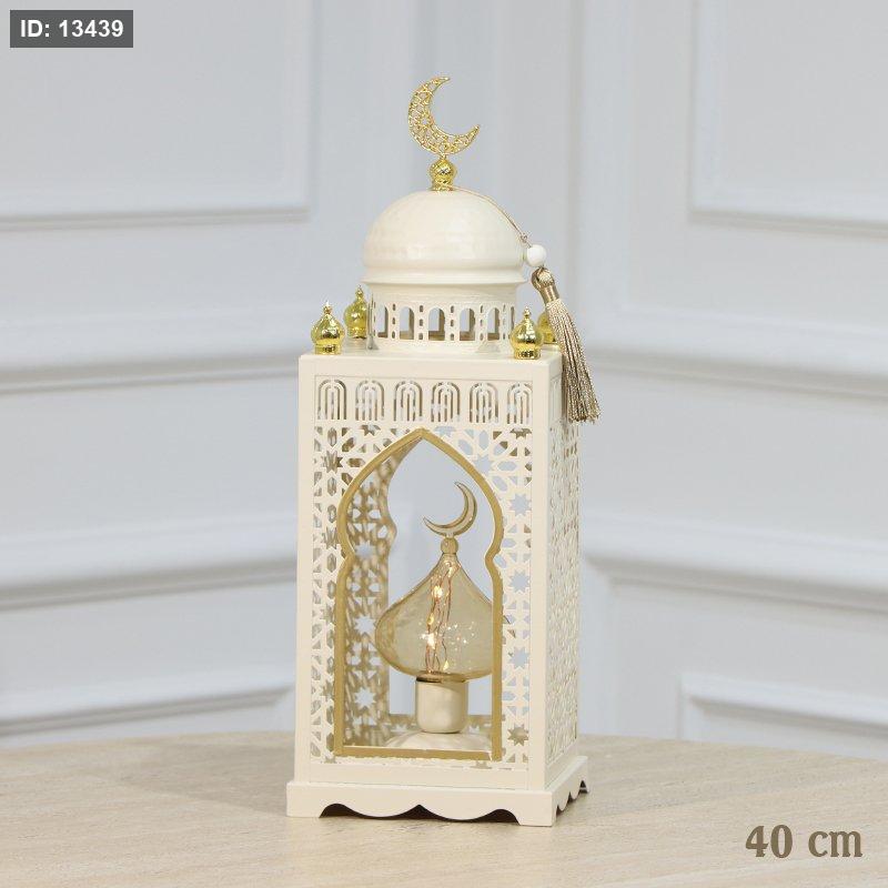 فانوس رمضان مستطيل 40سم تنك بيج وذهبي مأذنة اضاءة ذهبي بطاريات EL91/23 =رم1