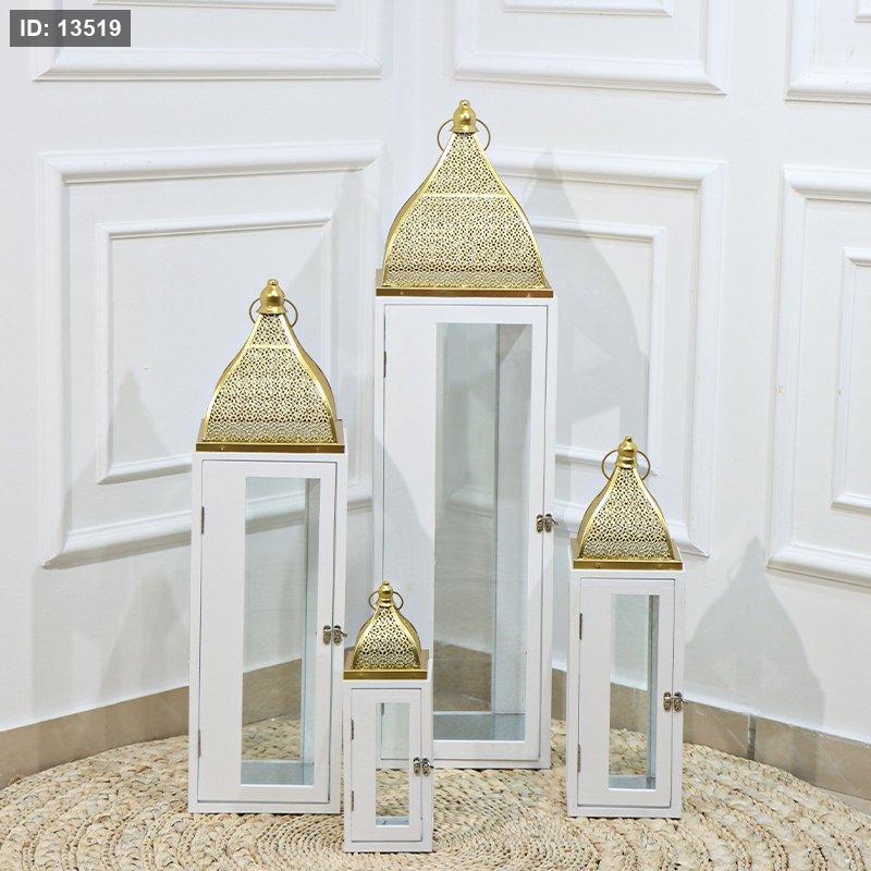طقم فانوس رمضان /4 احجام مربع خشب ابيض اطار تنك ذهبي EL16/4 =رم2