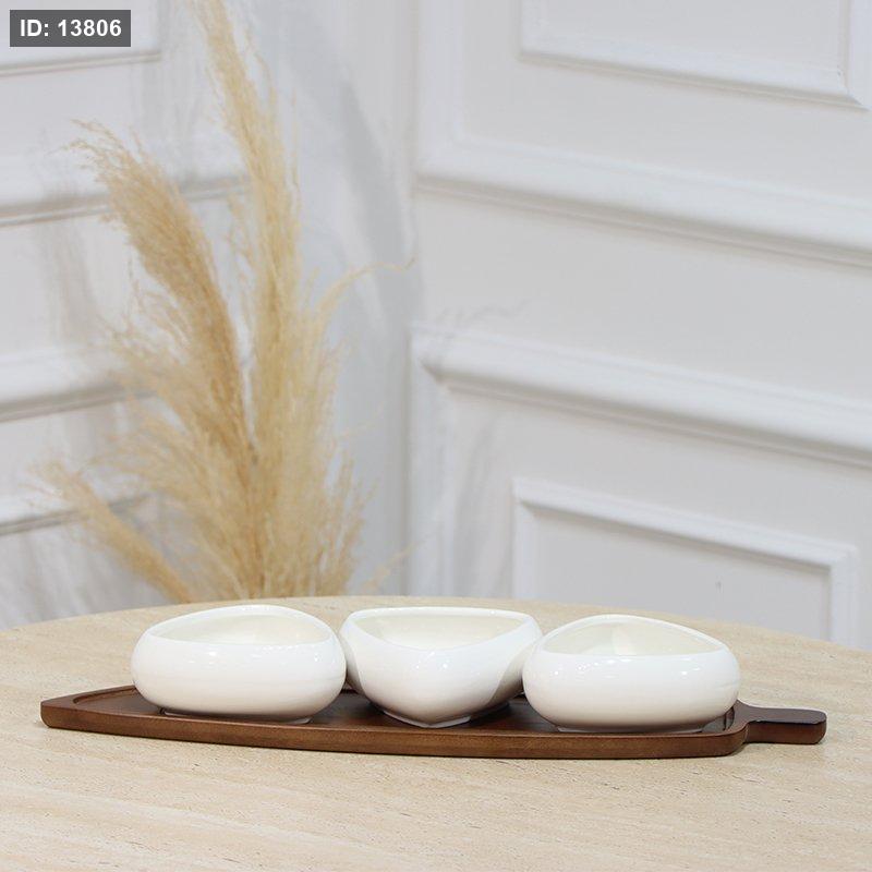 طقم/4 مضيفة خشب ورقة +3 صحون بورسلان ابيض شكل مثلث EL1/3 =رم4