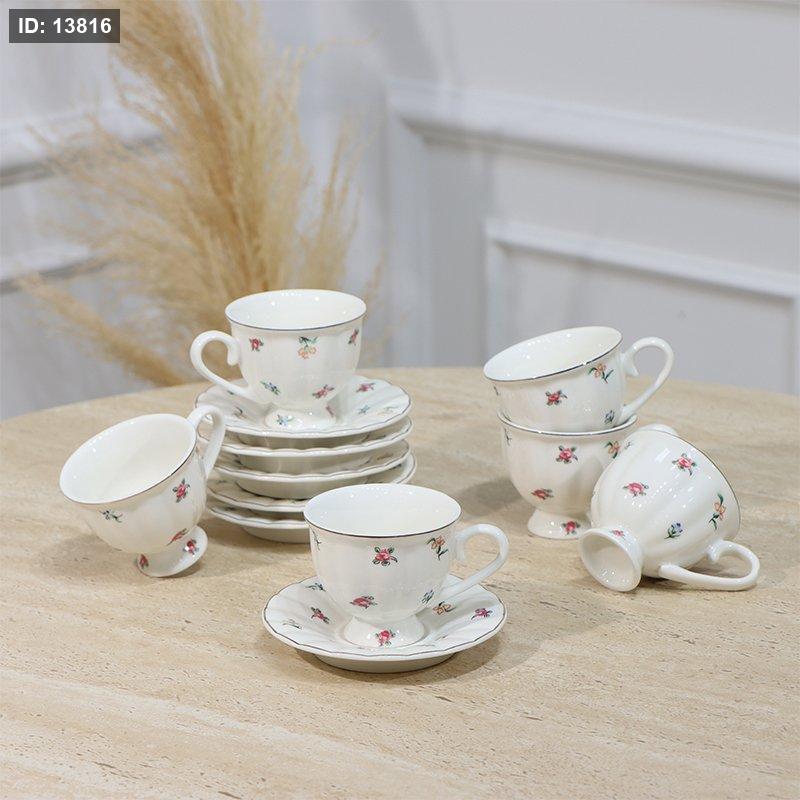 طقم فناجين قهوة 6/6 ابيض محزز مرسم ورد حيف ذهبي EL1/13 =رم4