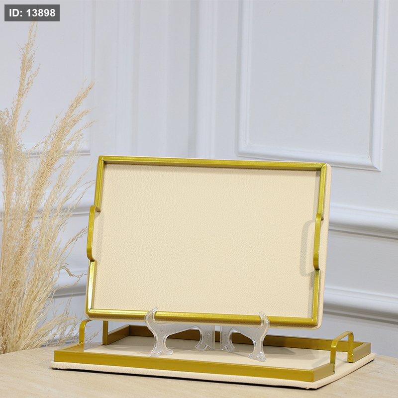 طقم صواني /2 مستطيل اطار تنك ذهبي وجه جلد كريمي بيدين مستطيل EL113/1 =رم6