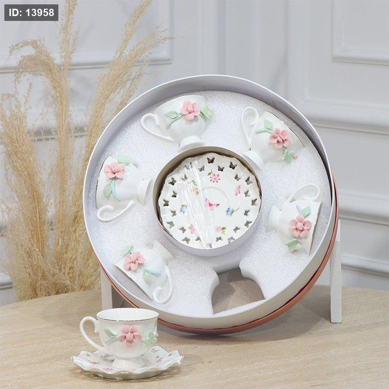 طقم فناجين قهوة 6/6 بورسلان ابيض مرسم وردة زهري اطار فراشة ملون بارز EL190/3 =ت.ش1