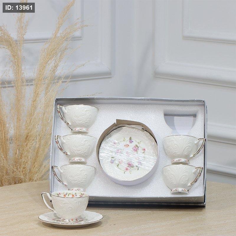 طقم فناجين قهوة 6/6 بورسلان ابيض مزخرف واطار وقاعدة مرسم وردة EL190/6 =ت.ش1