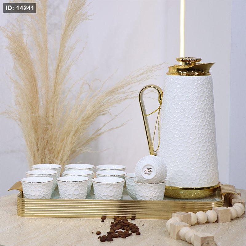 طقم/14 تيرموس قهوة+12 فنجان سادة بورسلان ابيض +صينية ذهبي BW06-14/S-WHITE ++و