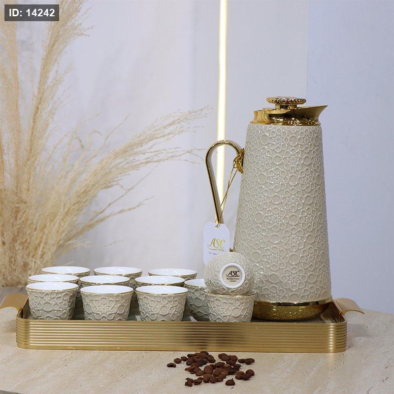 طقم/14 تيرموس قهوة+12 فنجان سادة بورسلان بيج+صينية ذهبي BW06-14/S-KHAKI ++و