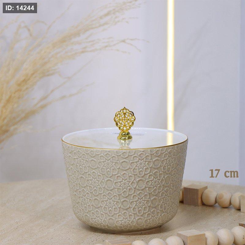 مضيفة 17سم مدور جور بورسلان بيج مزخرف اسلامي غطا اكرلك CAN21-2-KHAKI ++و
